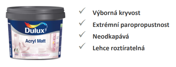 Dulux Acryl Matt White je matná, zářivě bílá, akrylátová emulzní barva určená k dekorativním a ochranným nátěrům stěn a stropů v interiéru. Je vyrobena z kvalitních surovin s optimalizovaným obsahem pigmentů. Zaručuje velmi dobré krytí a dlouhou životnost odstínu. Nátěr je odolný proti otěru, a mikroporézní struktura umožňuje dýchání stěn. Bělost barvy 98%, kryvost 1.